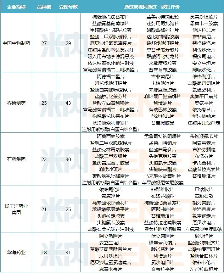 ![]() 米內(nèi)網(wǎng)數(shù)據(jù)庫(kù)顯示,截至目前通過(guò)或視同通過(guò)一致性評(píng)價(jià)品種TOP5企業(yè)(以集團(tuán)計(jì))分別是中國(guó)生物制藥(正大制藥 )、齊魯制藥、石藥集團(tuán)、揚(yáng)子江藥業(yè)集團(tuán)、華海藥業(yè)。其中,中國(guó)生物制藥以27個(gè)品種領(lǐng)跑一致性評(píng)價(jià)榜單。