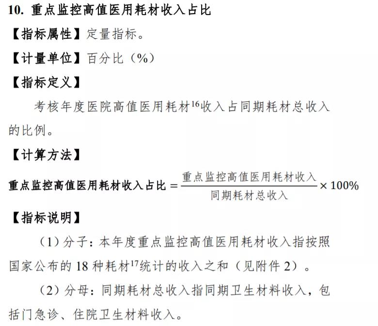 ![]() 其中分子是在本考核年度,重點監(jiān)控高值醫(yī)用耗材收入指第一批國家高值醫(yī)用耗材重點治理清單公布的 18 種醫(yī)用耗材的收入。