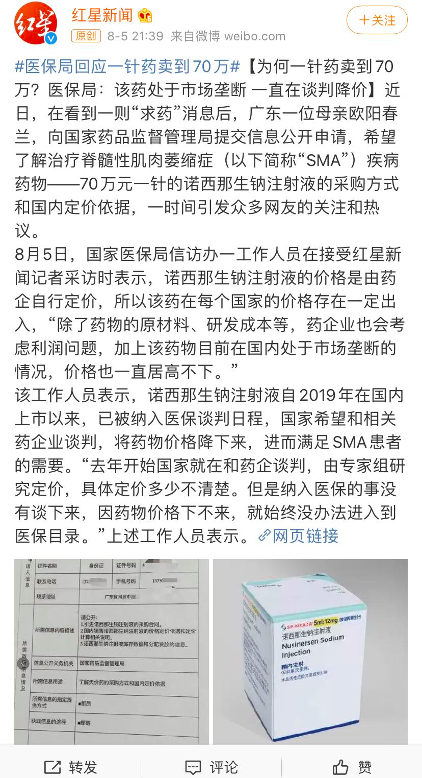 醫(yī)藥網(wǎng)8月10日訊 據(jù)紅星新聞報道,廣東一位母親,向國家藥監(jiān)局提交信息公開申請,希望了解70萬元一針的諾西那生鈉注射液的采購方式和國內(nèi)定價依據(jù),引發(fā)網(wǎng)友的關(guān)注和熱議。