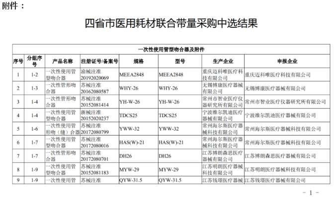 根據(jù)中選結(jié)果,一次性使用管型吻合器及附件中選企業(yè)包括重慶邁科唯、無錫博康、江蘇博朗森思、天津瑞奇外科等械企;