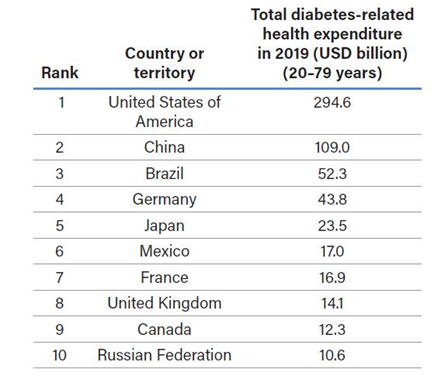 圖表3. 成年(20-79歲)糖尿病患者醫(yī)療相關(guān)支出前10名國家或地區(qū)(2019年)