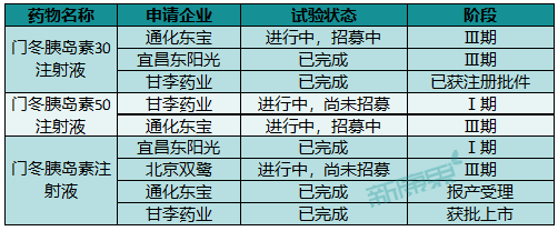 從門冬胰島素研發(fā)進展來看,甘李藥業(yè)、通化東寶、宜昌東陽光等藥企跑在前面。其中,甘李藥業(yè)已經(jīng)獲得門冬胰島素30注射液注冊批件,東陽光已經(jīng)完成三期試驗;通化東寶則在進行門冬胰島素50注射液三期試驗。