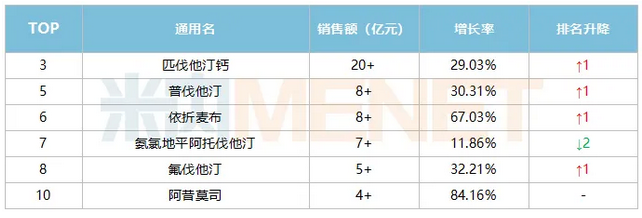 2020年中國公立醫(yī)療機構終端銷售額過億的血脂調(diào)節(jié)劑品種有11個,其中增速超過10%的有6個,復方制劑氨氯地平阿托伐他汀榜上有名,市場潛力可期。