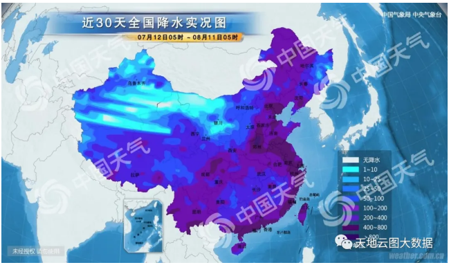 ![]() 圖:2021年7月12日至2021年8月11日全國降水實況圖(源自中國天氣)
